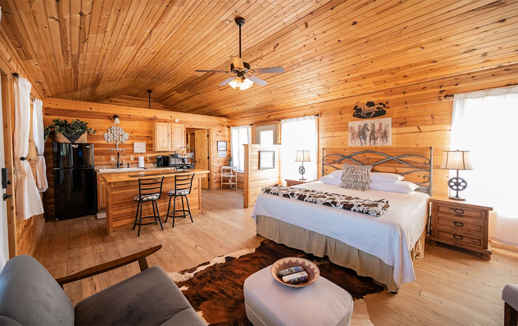 This one-bedroom, one-bath cabin is one of five deluxe private cabins located just 10 minutes from the town of Fredericksburg in the popular Texas Hill Country. Set along a creek and close to a winery, this cabin has lots of amenities, including a private hot tub and sauna.