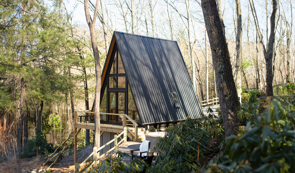 This brand-new modern A-Frame cabin with views, a hot tub, and a fire pit is described as “vintage camp meets Scandinavian modern.” The pet-friendly one-bedroom, one-bathroom cabin is just one mile from gorgeous hiking trails and 15 minutes to the Western Carolina Nature Center.