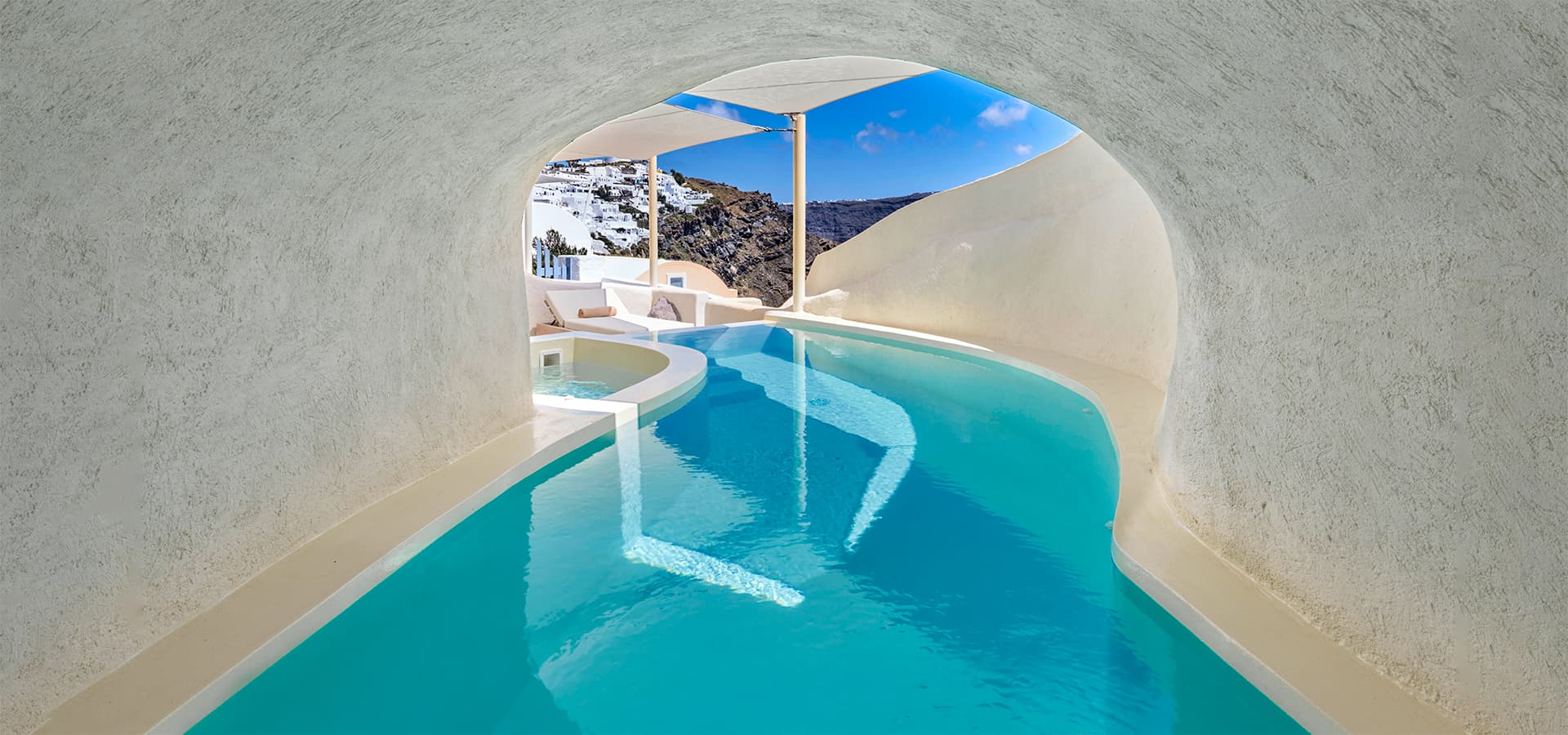 This Cycladic architecture-style hotel is carved into the Caldera cliffs, overlooking the azure-blue waters of the Aegean Sea. Mystique Santorini is linked by a network of cobbled pathways that lead to all 41 of the stone-crafted, cave-style suites and villas, each with panoramic views and featuring private Jacuzzis or pools hanging from the cliff.
