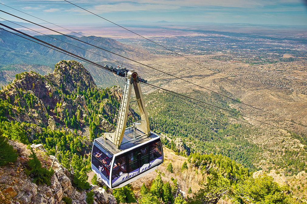 The Sandia Peak Aerial Tramway is a 15-minute tram ride reaching the 10,378-foot elevation observation deck at the crest of the Sandia Mountains.